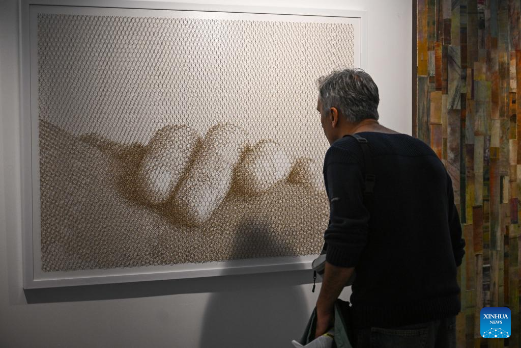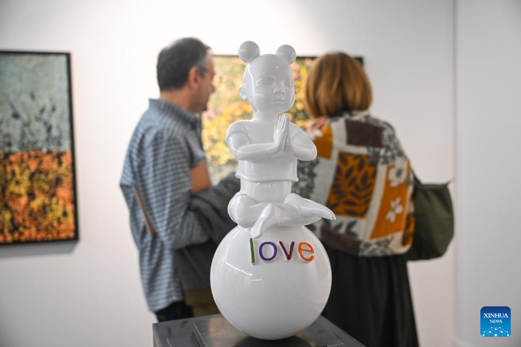 Artworks on display are pictured at the 12th Artweeks Istanbul in Istanbul, Türkiye, Oct. 25, 2025. The 12th edition of Artweeks Istanbul was held in Türkiye's largest city Istanbul from Oct. 15 to 26. Hundreds of artworks were on display to the public for free, attracting many visitors to enjoy the event. (Xinhua/Liu Lei)