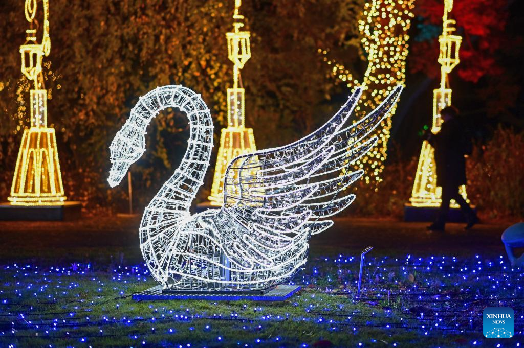 Light installations are seen at the Garden of Lights show at the Botanical Garden of the Polish Academy of Sciences in suburban Warsaw, Poland, on Oct. 25, 2025. This year's exhibition, themed "Beauty and the Beast," has attracted many residents and tourists. (Photo by Aleksy Witwicki/Xinhua)