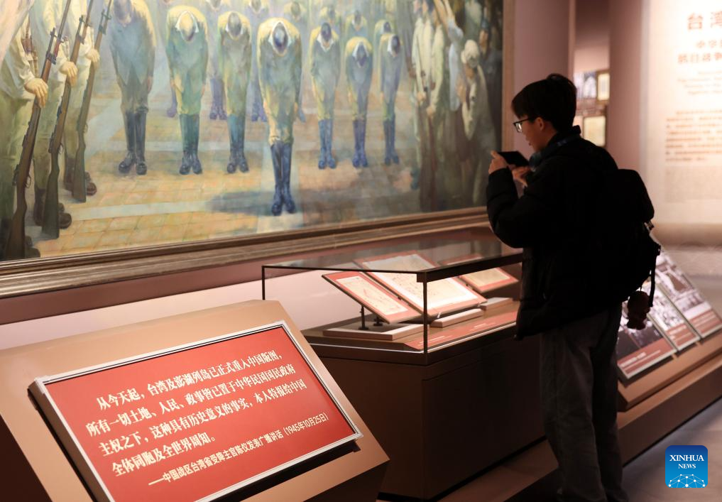 A man takes photos at "Unyielding Treasure Island: Loyal to the Motherland," an exhibition on the history of Taiwan compatriots' resistance against Japanese aggression, at the Museum of the War of Chinese People's Resistance Against Japanese Aggression in Beijing, capital of China, Oct. 25, 2025. Featuring 387 archive photographs and 453 cultural relics, the exhibition opened here on Saturday to commemorate the 80th anniversary of Taiwan's restoration to China. (Xinhua/Zhang Chenlin)