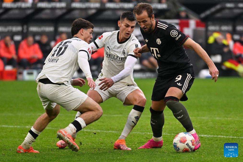Philipp Sander (L), Yannik Engelhardt (C) of Borussia Moenchengladbach vie with Harry Kane of Bayern Munich during the first division of Bundesliga football match in Moenchengladbach, Germany, Oct. 25, 2025. (Photo by Ulrich Hufnagel/Xinhua)