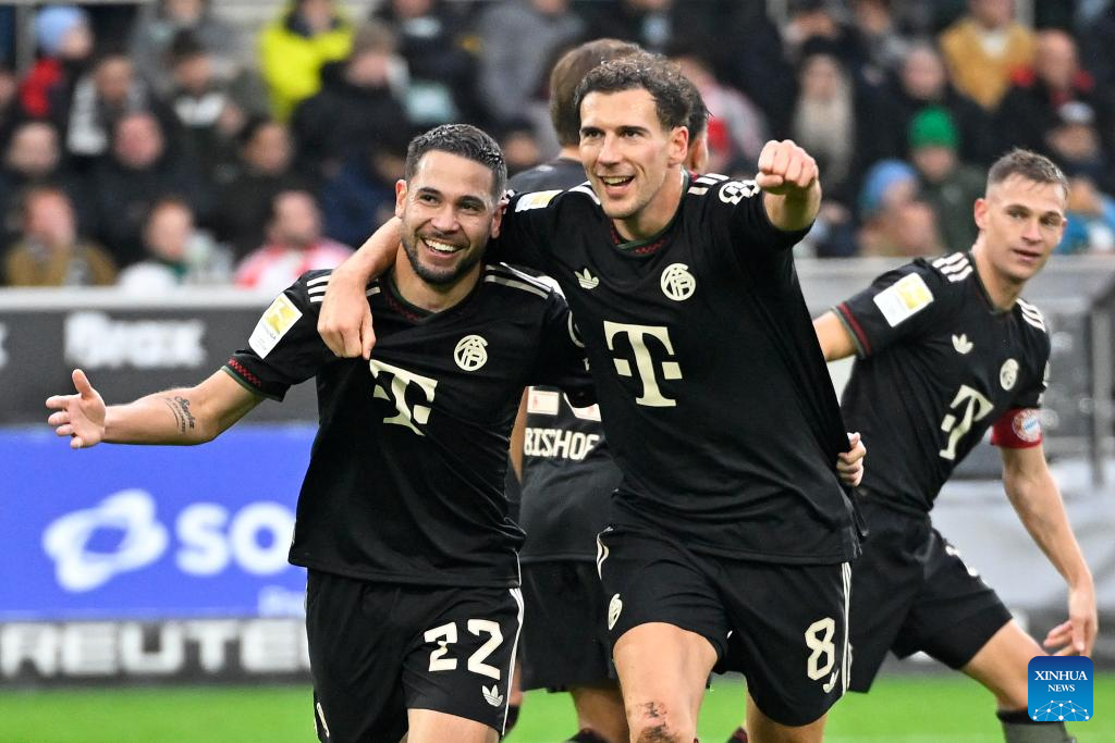 Raphael Guerreiro (L, front) and Leon Goretzka (R, front) of Bayern Munich celebrate scoring during the first division of Bundesliga football match between Borussia Moenchengladbach and Bayern Munich in Moenchengladbach, Germany, Oct. 25, 2025. (Photo by Ulrich Hufnagel/Xinhua)