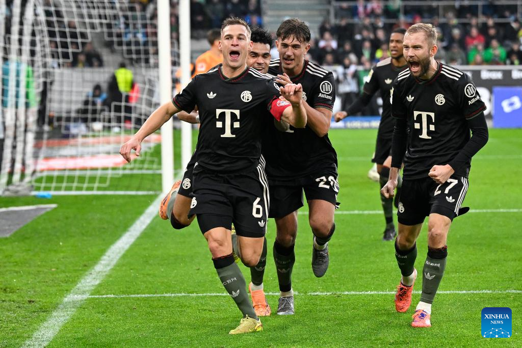 Joshua Kimmich (front) of Bayern Munich celebrates scoring with teammates during the first division of Bundesliga football match between Borussia Moenchengladbach and Bayern Munich in Moenchengladbach, Germany, Oct. 25, 2025. (Photo by Ulrich Hufnagel/Xinhua)