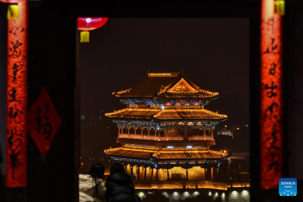 This photo taken on Oct. 22, 2025 shows a night view of the Xinzhou ancient city in Xinzhou, north China's Shanxi Province. Leisure tourism in Xinzhou ancient city remains booming in late autumn. Tourism activities such as bathing in hot springs, taking photos in ancient costumes, and watching intangible cultural heritage performances have attracted many tourists to visit the ancient city for a few days, to deeply immerse themselves in the unique charm of traditional culture. (Xinhua/Cao Yang)