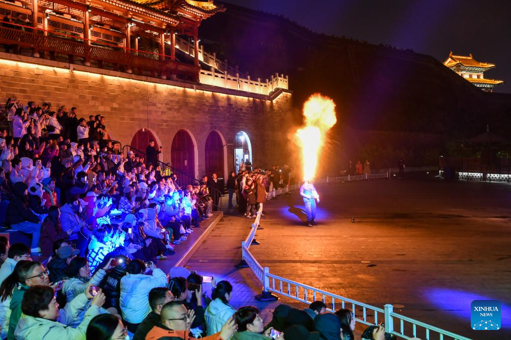 This photo taken on Oct. 23, 2025 show a performance of Huohu (fire pot) in Xinzhou ancient city in Xinzhou, north China's Shanxi Province. Leisure tourism in Xinzhou ancient city remains booming in late autumn. Tourism activities such as bathing in hot springs, taking photos in ancient costumes, and watching intangible cultural heritage performances have attracted many tourists to visit the ancient city for a few days, to deeply immerse themselves in the unique charm of traditional culture. (Xinhua/Cao Yang)