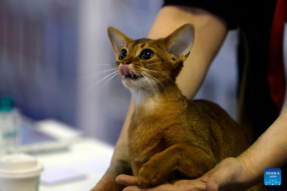An Abyssinian cat is being judged during the Worldshow Romania 2025 feline championship at Romexpo in Bucharest, Romania, Oct. 25, 2025. More than 1,000 cats from more than 30 countries participated in the two-day feline beauty contest. (Photo by Cristian Cristel/Xinhua)