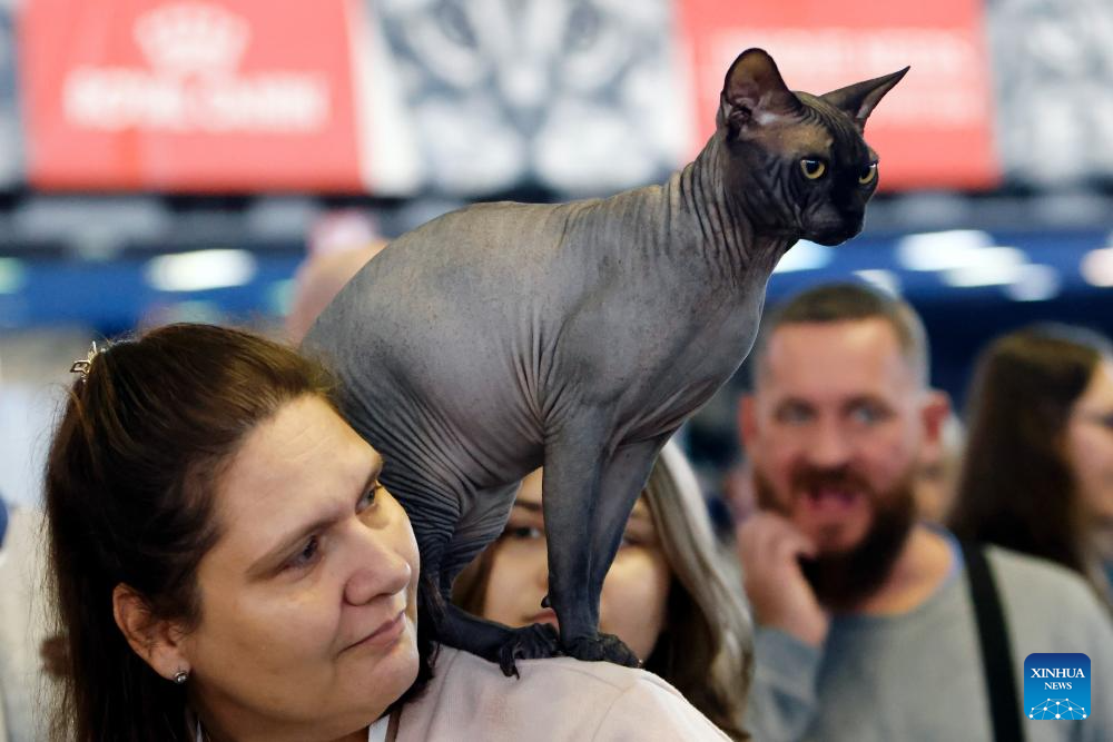 A Sphinx cat is being judged during the Worldshow Romania 2025 feline championship at Romexpo in Bucharest, Romania, Oct. 25, 2025. More than 1,000 cats from more than 30 countries participated in the two-day feline beauty contest. (Photo by Cristian Cristel/Xinhua)