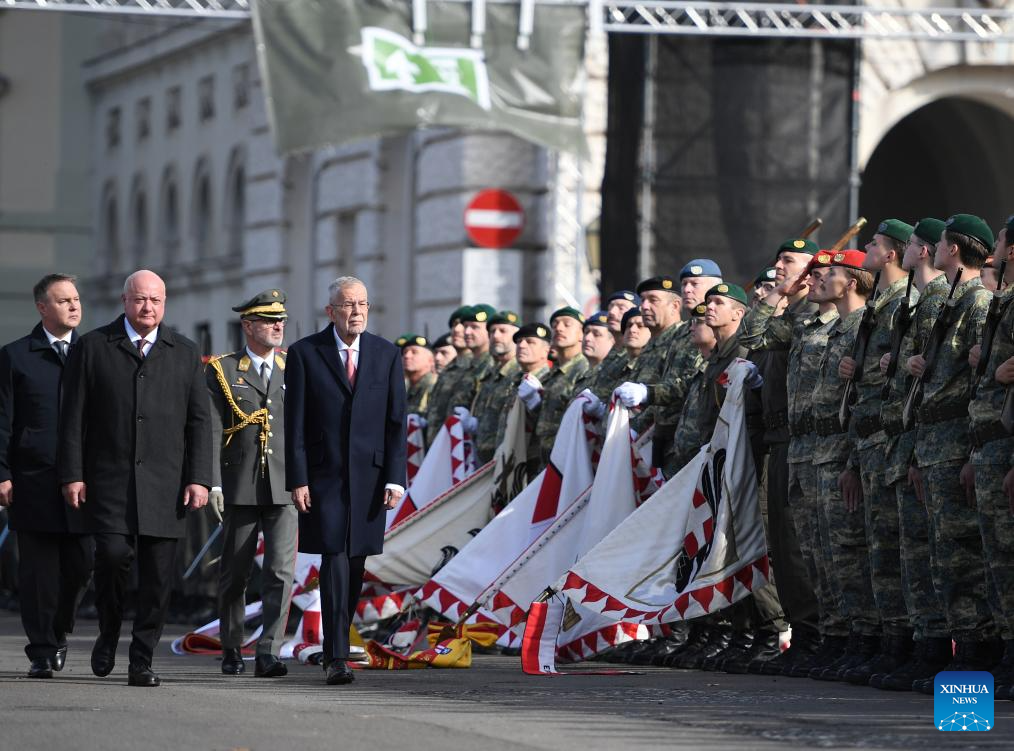 Austrian President Alexander Van der Bellen (R, front) and Chancellor Christian Stocker (L, front) review army recruits during the National Day celebrations in Vienna, Austria, on Oct. 26, 2025. (Xinhua/He Canling)