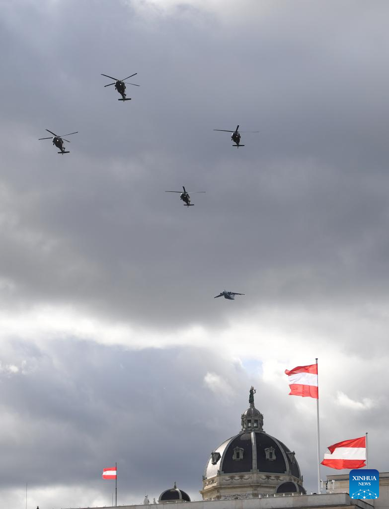 Helicopters fly over Hofburg during the National Day celebrations in Vienna, Austria, on Oct. 26, 2025. (Xinhua/He Canling)