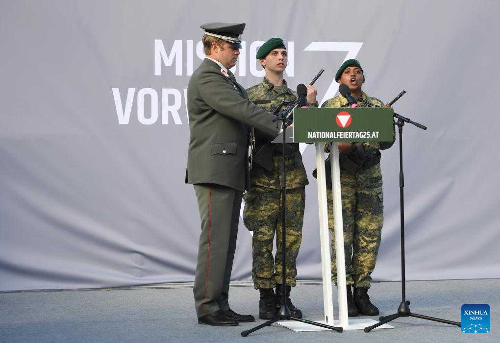 Representatives of Austrian army recruits swear an oath during the National Day celebrations in Vienna, Austria, on Oct. 26, 2025. (Xinhua/He Canling)