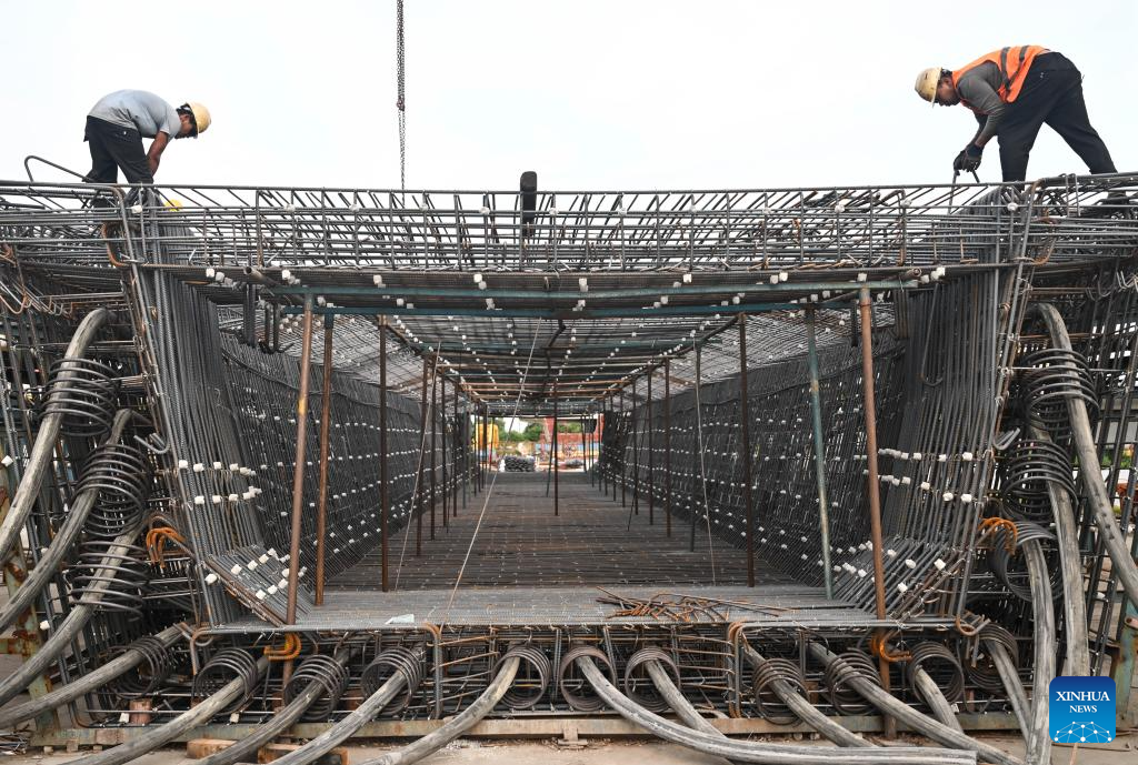 Workers operate at the beam fabrication site of the Shanghai-Nanjing section along the Shanghai-Chongqing-Chengdu High-speed Railway in Banjing Township of Rugao, east China's Jiangsu Province, Oct. 27, 2025. The box girder prefabrication work at this site has entered its final phase. (Xinhua/Ji Chunpeng)