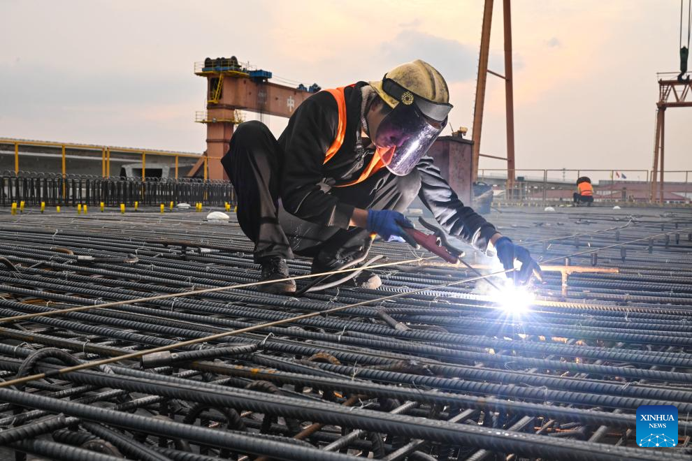 A worker operates at the beam fabrication site of the Shanghai-Nanjing section along the Shanghai-Chongqing-Chengdu High-speed Railway in Banjing Township of Rugao, east China's Jiangsu Province, Oct. 27, 2025. The box girder prefabrication work at this site has entered its final phase. (Xinhua/Ji Chunpeng)