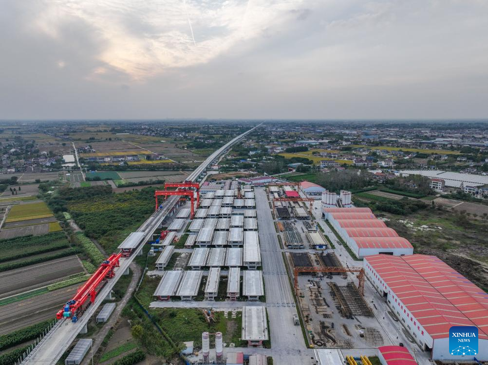 A drone photo shows a view of the beam fabrication site of the Shanghai-Nanjing section along the Shanghai-Chongqing-Chengdu High-speed Railway in Banjing Township of Rugao, east China's Jiangsu Province, Oct. 27, 2025. The box girder prefabrication work at this site has entered its final phase. (Xinhua/Ji Chunpeng)