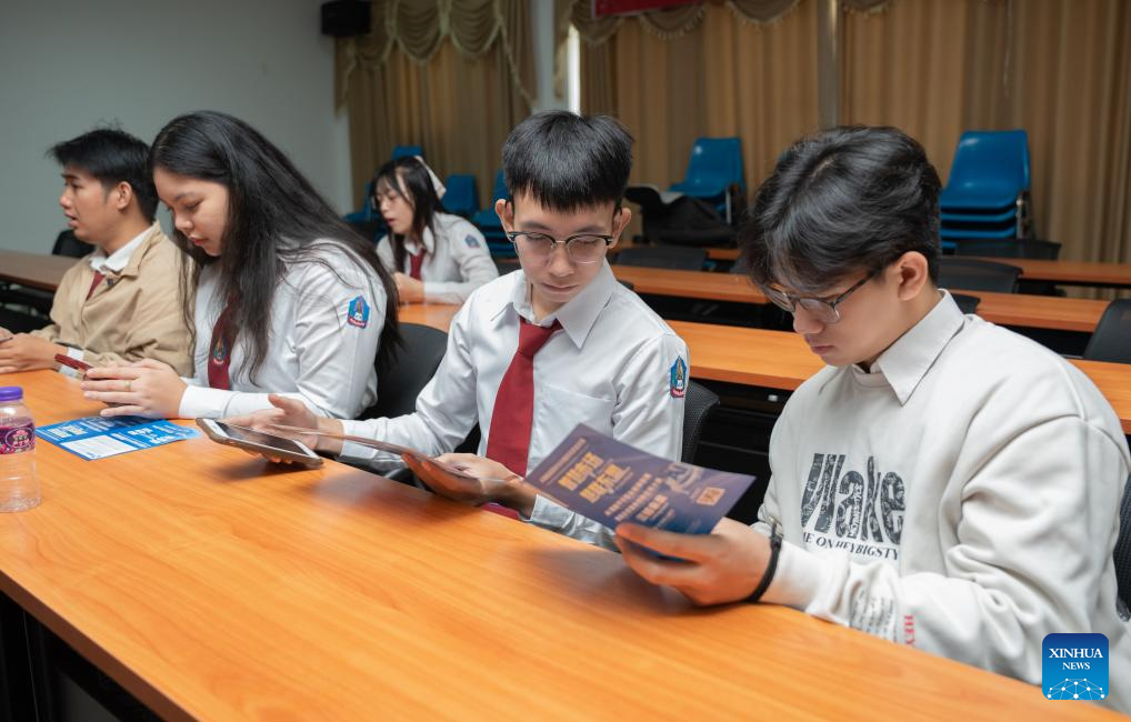 Students from the National University of Laos participate in an exchange event aimed to promote the integration of artificial intelligence (AI) with the legal industry in Vientiane, capital of Laos, Oct. 23, 2025. (Photo by Kaikeo Saiyasane/Xinhua)