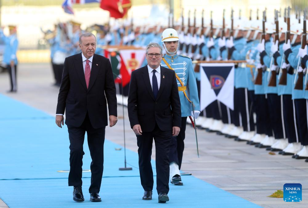Turkish President Recep Tayyip Erdogan (L) and British Prime Minister Keir Starmer review the guards of honor during a welcoming ceremony, in Ankara, Türkiye, Oct. 27, 2025. (Mustafa Kaya/Handout via Xinhua)