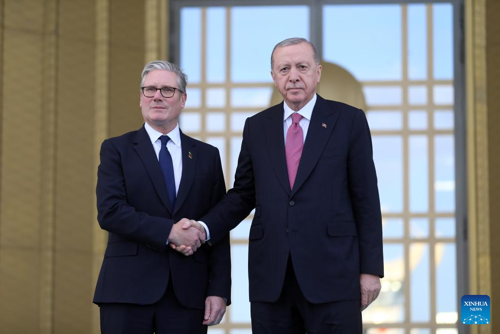 Turkish President Recep Tayyip Erdogan (R) shakes hands with visiting British Prime Minister Keir Starmer during a welcoming ceremony, in Ankara, Türkiye, Oct. 27, 2025. (Mustafa Kaya/Handout via Xinhua)