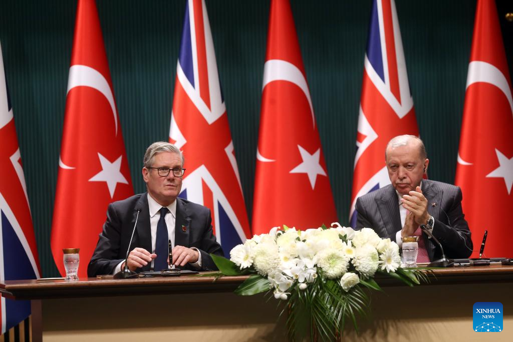 British Prime Minister Keir Starmer (L) delivers statements following the signing ceremony with Turkish President Recep Tayyip Erdogan in Ankara, Türkiye, Oct. 27, 2025. Türkiye signed a deal on Monday to buy 20 Eurofighter Typhoon fighter jets from Britain for 8 billion pounds (10.64 billion U.S. dollars), as Ankara seeks to bolster its defense capabilities amid a turbulent regional landscape. (Mustafa Kaya/Handout via Xinhua)