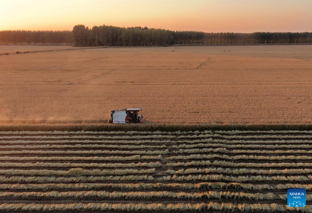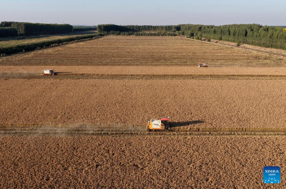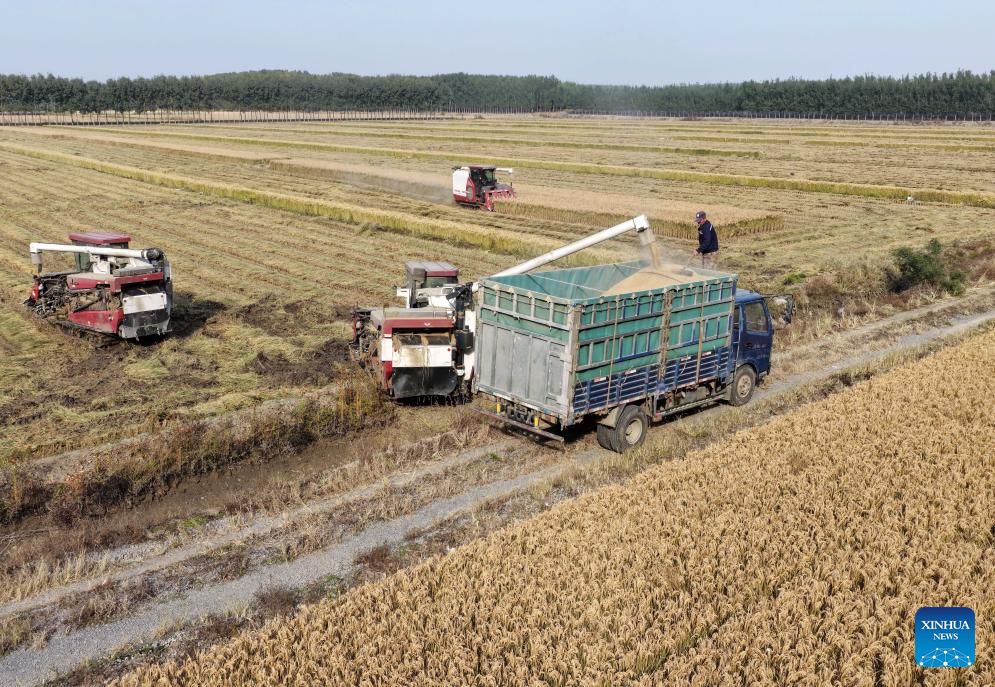 A drone photo taken on Oct. 27, 2025 shows farmers harvesting rice in a field in Fengnan District of Tangshan City, north China's Hebei Province. The rice harvest season has arrived in Tangshan City, where farmers are seizing the good weather to accelerate harvesting. (Xinhua/Yang Shiyao)