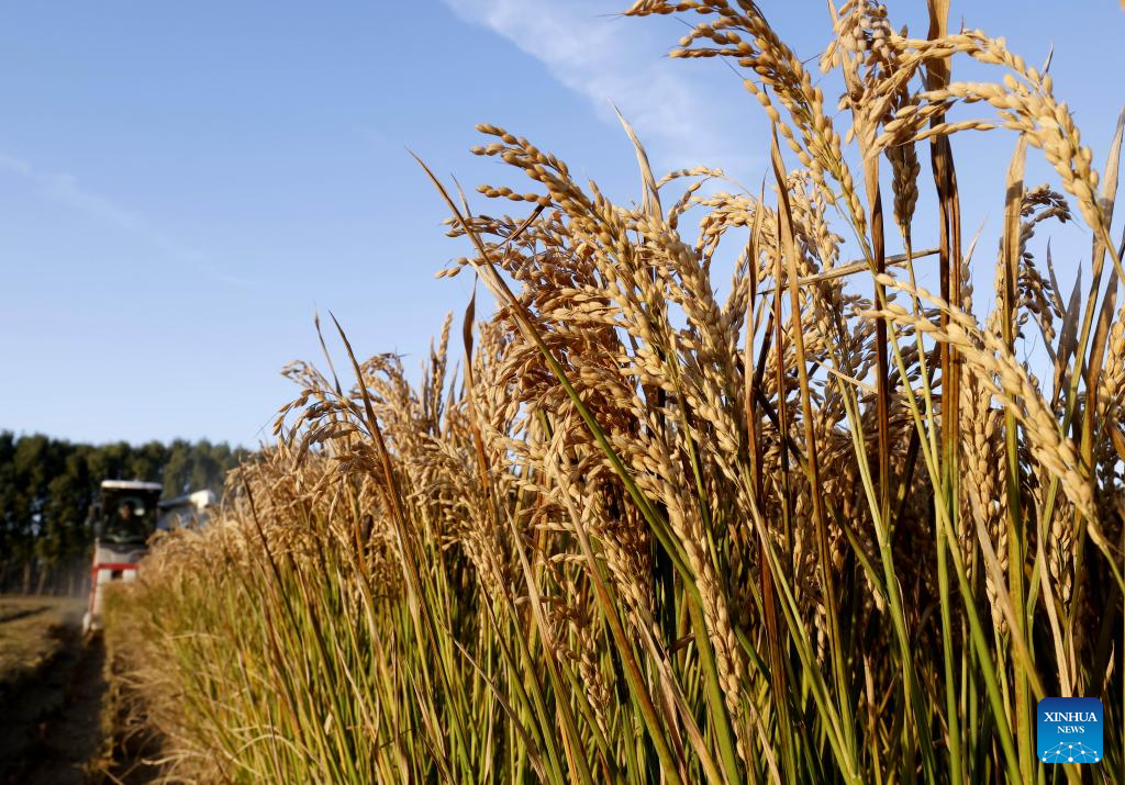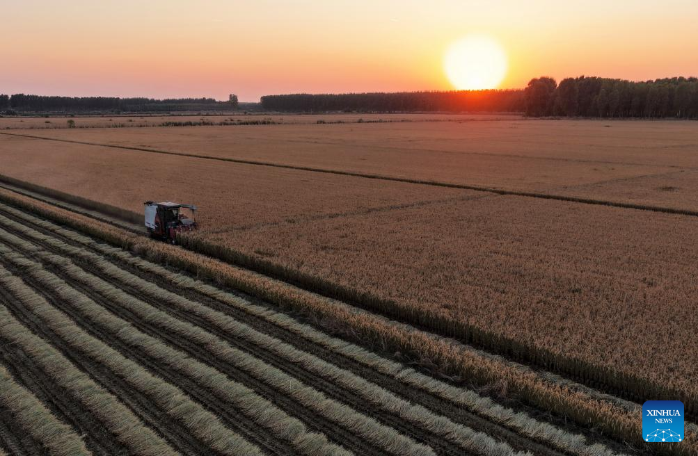 A farmer harvests rice in a field in Fengnan District of Tangshan City, north China's Hebei Province, Oct. 27, 2025. The rice harvest season has arrived in Tangshan City, where farmers are seizing the good weather to accelerate harvesting. (Xinhua/Yang Shiyao)