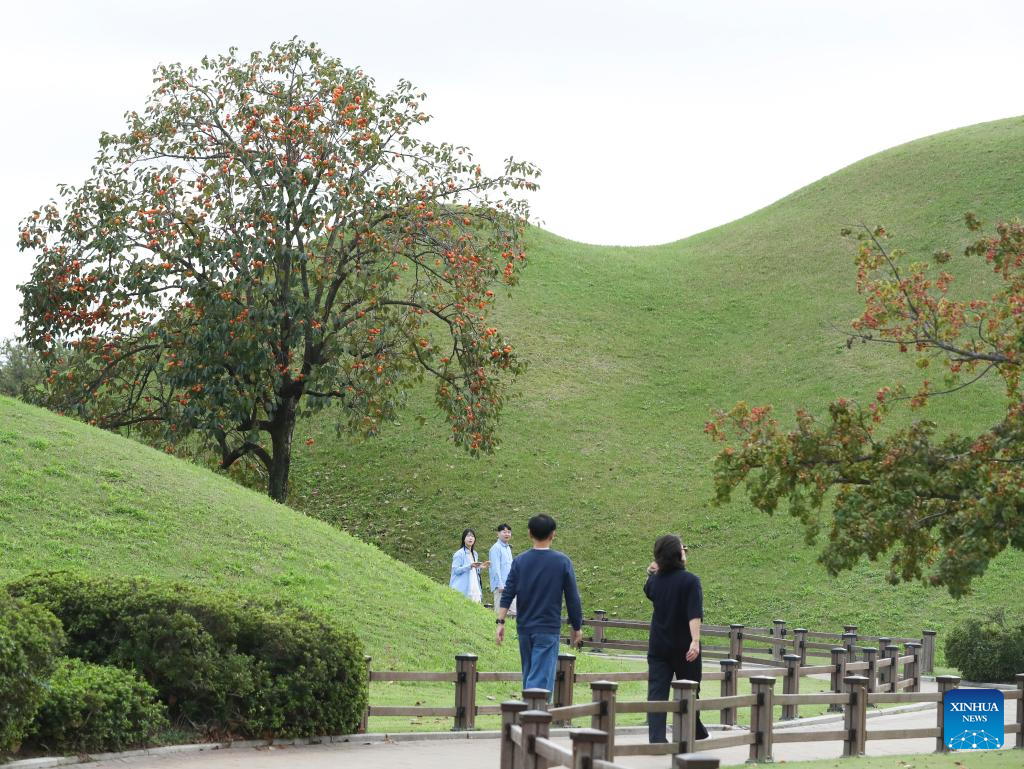 Tourists visit the Daereungwon ancient tomb complex in Gyeongju, South Korea, Oct. 17, 2025. Gyeongju, a city in southeastern South Korea, is often referred to as an "open-air museum" as it is the city with the most UNESCO World Heritage Sites in the country. (Xinhua/Yao Qilin)