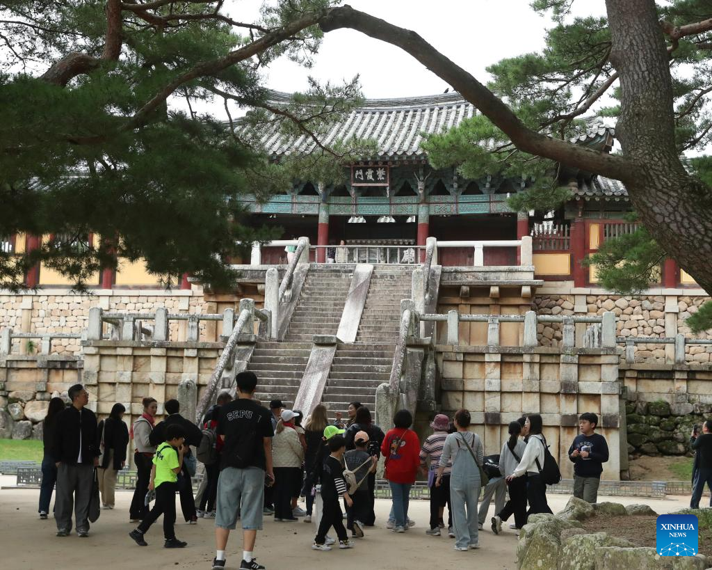 People visit Bulguksa Temple in Gyeongju, South Korea, Oct. 17, 2025. Gyeongju, a city in southeastern South Korea, is often referred to as an "open-air museum" as it is the city with the most UNESCO World Heritage Sites in the country. (Xinhua/Yao Qilin)
