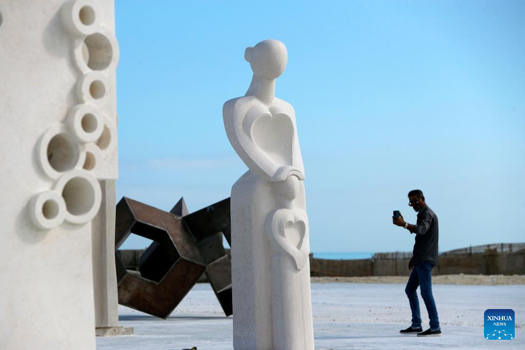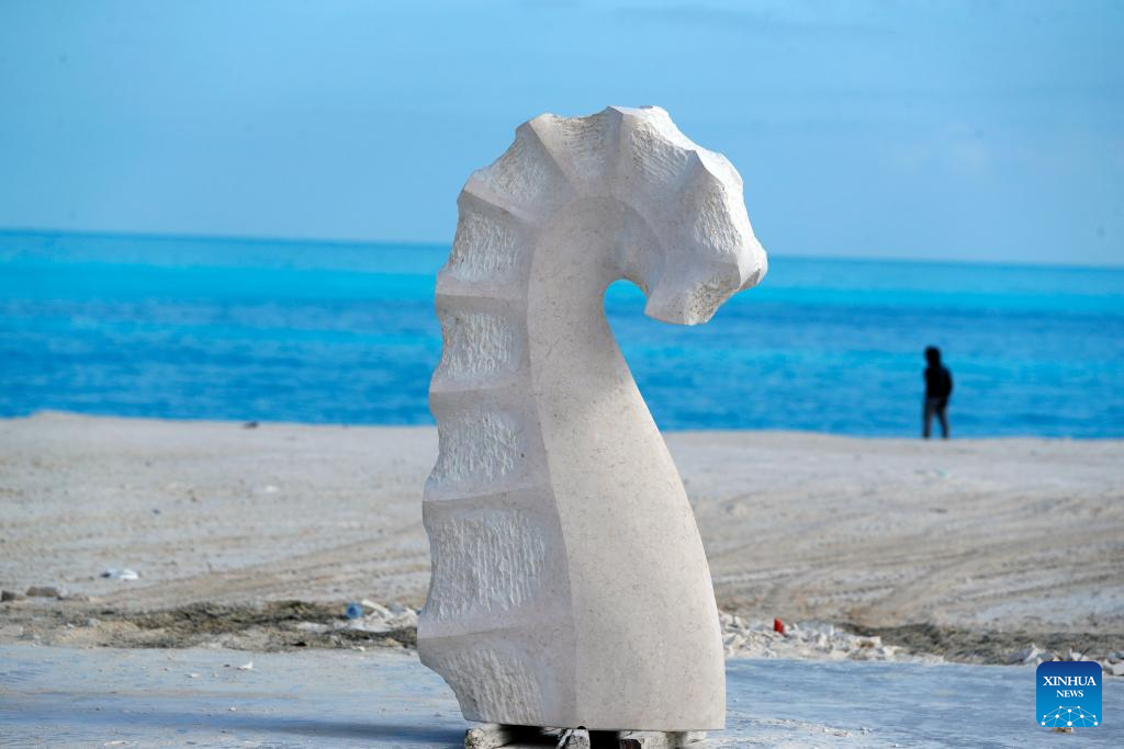 Photo taken on Oct. 27, 2025 shows a sculpture created during the Egypt Sculpture Symposium in New Alamein City, Matrouh Governorate, Egypt. Under the Mediterranean sky, rows of white sculptures rise along the seaside promenade of New Alamein, an emerging city. Abstract forms and graceful human figures stand in silent dialogue with the sea, turning the esplanade into an open-air gallery that speaks to New Alamein's modern identity. (Xinhua/Ahmed Gomaa)