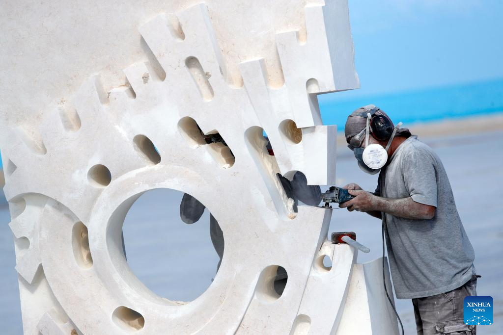 An artist sculpts during the Egypt Sculpture Symposium in New Alamein City, Matrouh Governorate, Egypt, Oct. 27, 2025. Under the Mediterranean sky, rows of white sculptures rise along the seaside promenade of New Alamein, an emerging city. Abstract forms and graceful human figures stand in silent dialogue with the sea, turning the esplanade into an open-air gallery that speaks to New Alamein's modern identity. (Xinhua/Ahmed Gomaa)