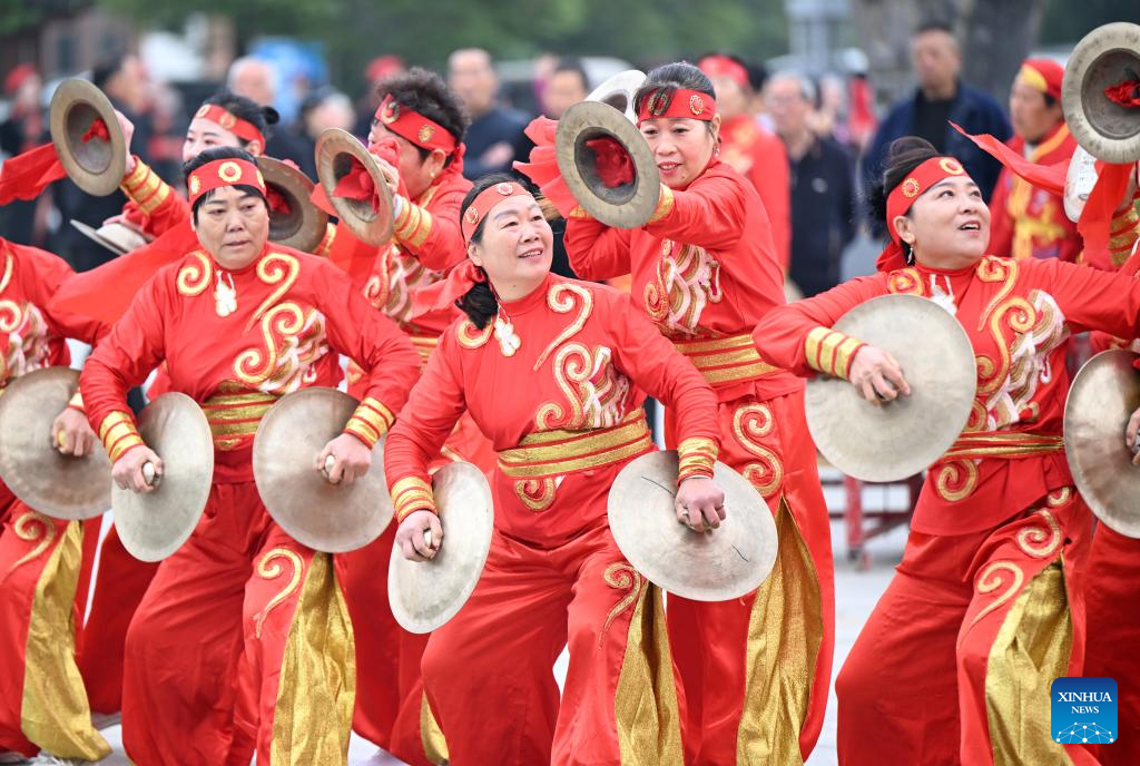 A local gong and drum team performs during an event celebrating Chongyang Festival in Xiping County, central China's Henan Province, Oct. 29, 2025. A series of celebration activities were held across the country to mark Chongyang Festival, which falls on Oct. 29 this year. Also known as China's Seniors' Day, it honors the country's traditional virtues of filial piety and family love. (Xinhua/Li Jianan)