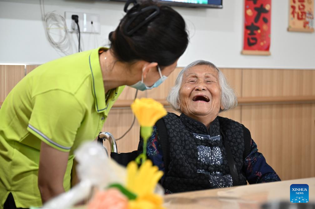An elderly person chats with a staff worker at an elderly care service center in Qiongshan District of Haikou, south China's Hainan Province, Oct. 29, 2025.