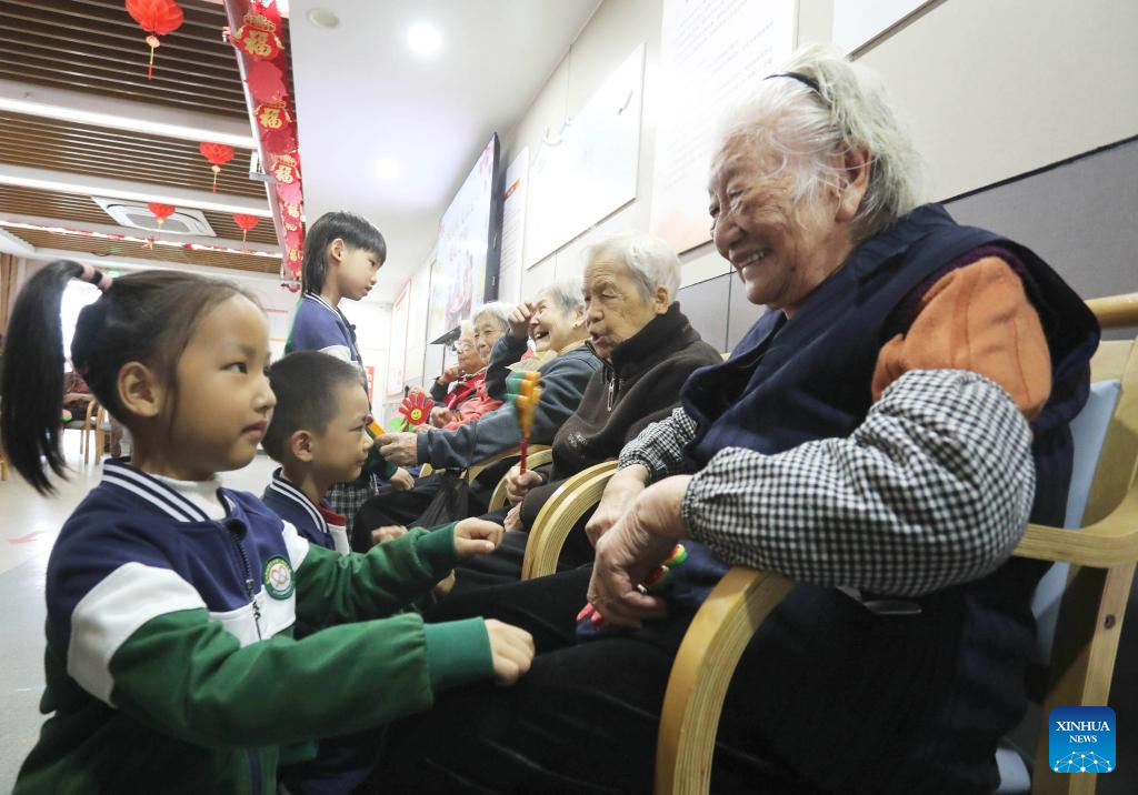 Kindergarten children pay a visit to senior citizens at an apartment for the elderly in Suzhou City, east China's Jiangsu Province, Oct. 29, 2025. A series of celebration activities were held across the country to mark Chongyang Festival, which falls on Oct. 29 this year. Also known as China's Seniors' Day, it honors the country's traditional virtues of filial piety and family love. (Photo by Hang Xingwei/Xinhua)