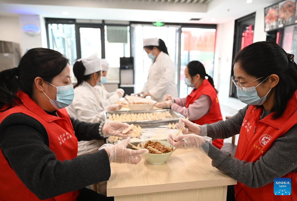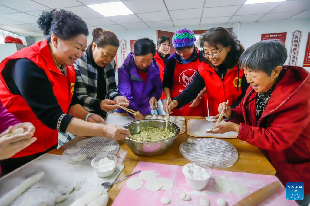 Volunteers make dumplings at a community canteen for local elderly people in Xiping County, central China's Henan Province, Oct. 29, 2025. A series of celebration activities were held across the country to mark Chongyang Festival, which falls on Oct. 29 this year. Also known as China's Seniors' Day, it honors the country's traditional virtues of filial piety and family love. (Xinhua/Li Jianan)