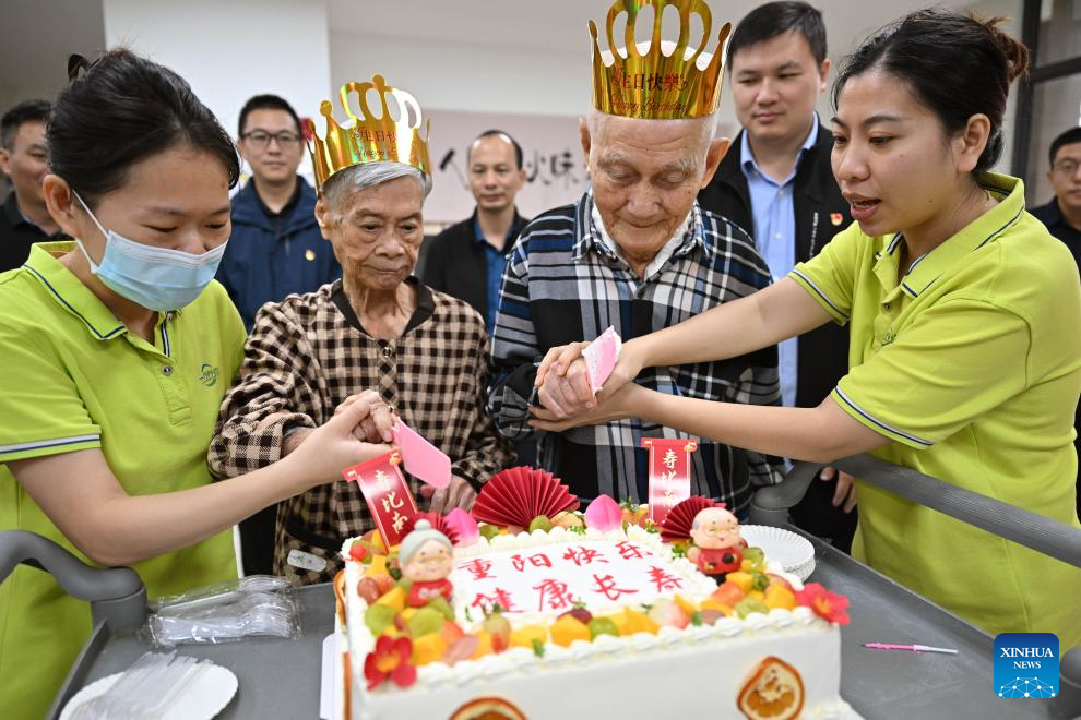 Two elderly people cut a birthday cake at an elderly care service center in Qiongshan District of Haikou, south China's Hainan Province, Oct. 29, 2025.