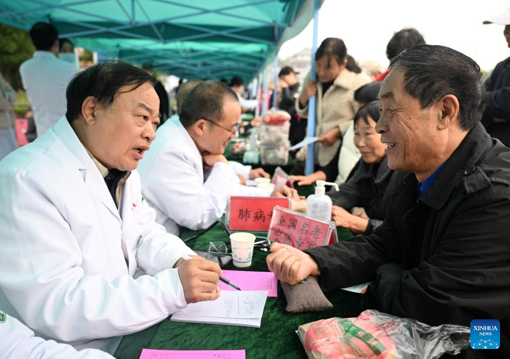 Doctors offer free medical consultations to senior citizens during an event celebrating Chongyang Festival in Xiping County, central China's Henan Province, Oct. 29, 2025. A series of celebration activities were held across the country to mark Chongyang Festival, which falls on Oct. 29 this year. Also known as China's Seniors' Day, it honors the country's traditional virtues of filial piety and family love. (Xinhua/Li Jianan)