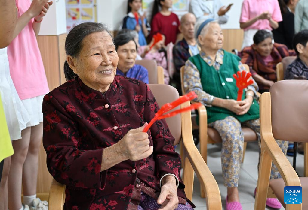 Some elderly people watch performances from volunteers at an elderly care service center in Qiongshan District of Haikou, south China's Hainan Province, Oct. 29, 2025.