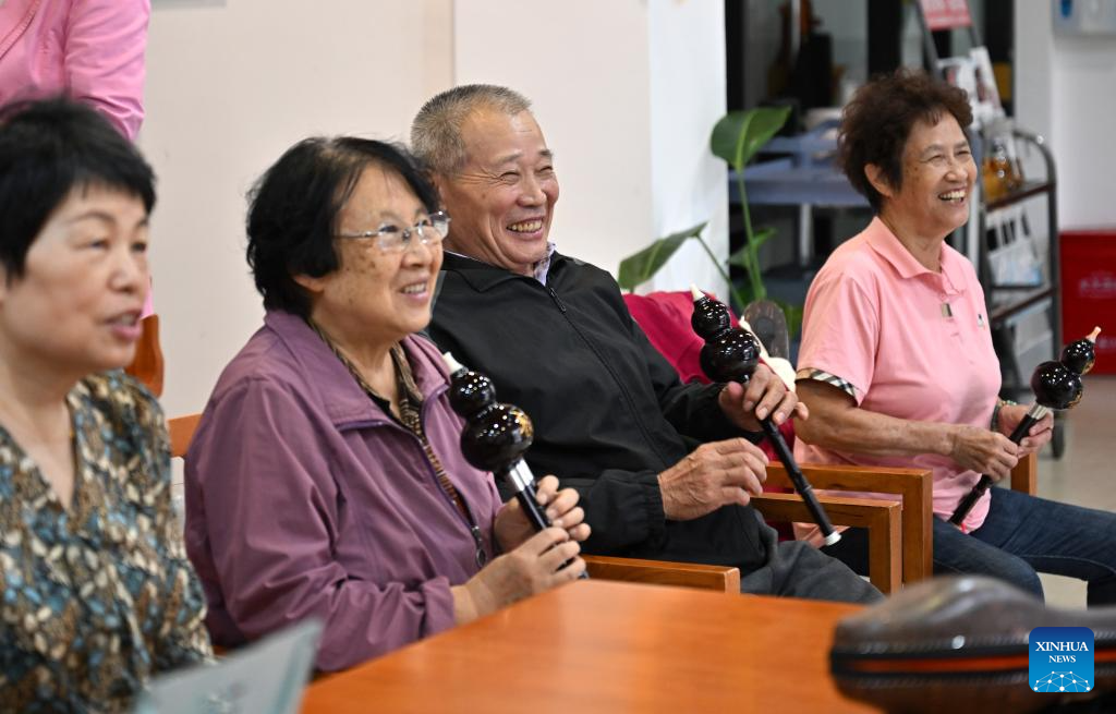 Some elderly people learn to play the Hulusi, a traditional Chinese wind instrument, at an elderly care service center in Qiongshan District of Haikou, south China's Hainan Province, Oct. 28, 2025.
