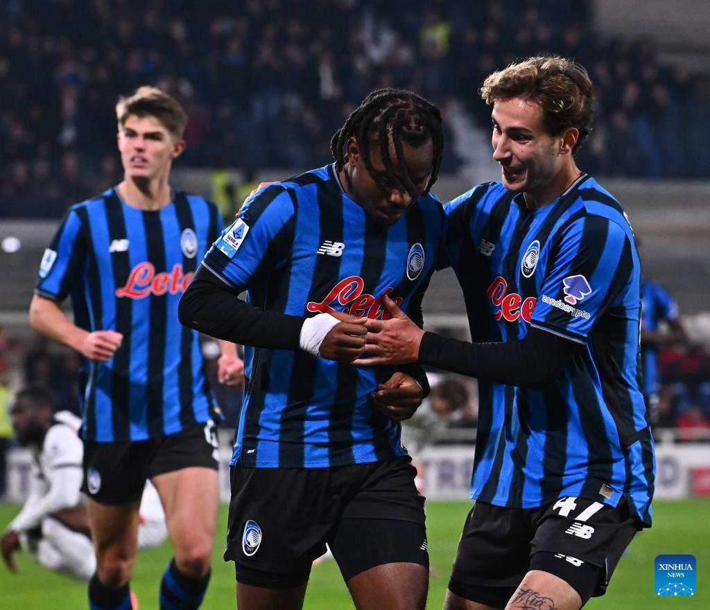 Atalanta's Ademola Lookman (C) celebrates his goal with his teammate Lorenzo Bernasconi (R) during a Serie A football match between Atalanta and AC Milan in Bergamo, Italy, Oct. 28, 2025. (Photo by Alberto Lingria/Xinhua)