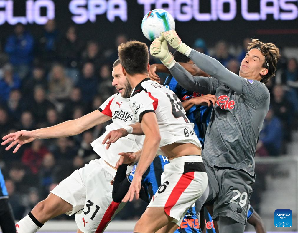 AC Milan's Strahinja Pavlovic (L) and Matteo Gabbia (C) vie with Atalanta's goalkeeper Marco Carnesecchi during a Serie A football match between Atalanta and AC Milan in Bergamo, Italy, Oct. 28, 2025. (Photo by Alberto Lingria/Xinhua)