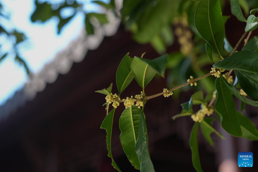 This photo taken on Oct. 29, 2025 shows a view of osmanthus flowers at a temple in the West Lake scenic spot in Hangzhou, east China's Zhejiang Province. Recently, osmanthus flowers in Hangzhou have entered blooming period. More than 5 million osmanthus trees are planted across the city, according to local authorities. (Xinhua/Huang Zongzhi)