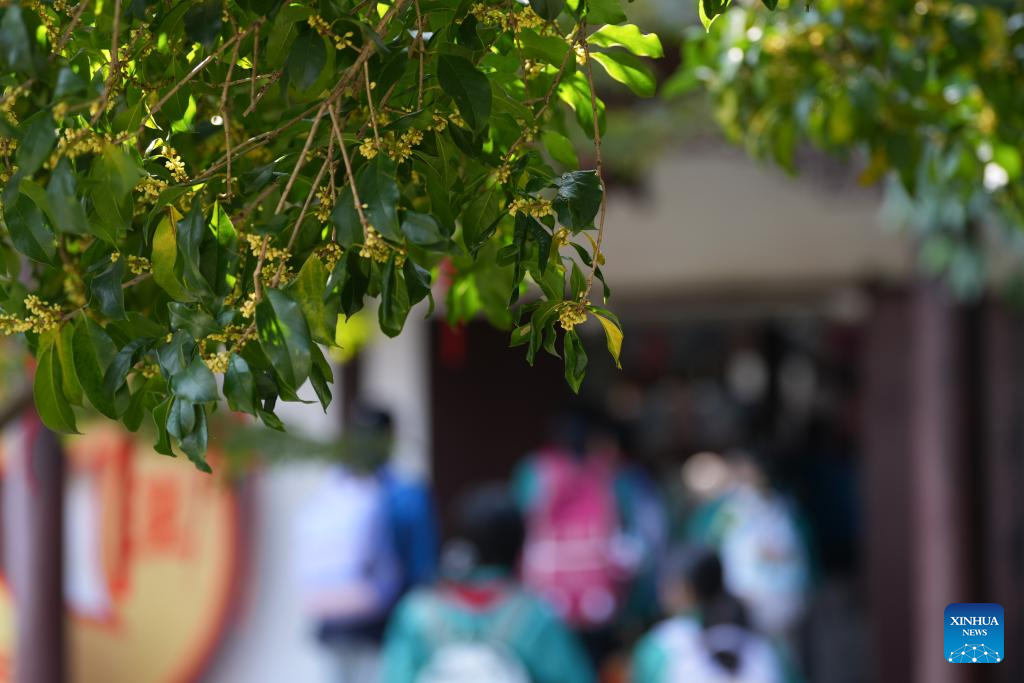 Tourists take photos of osmanthus flowers at Manjuelong Village in Hangzhou, east China's Zhejiang Province, Oct. 29, 2025. Recently, osmanthus flowers in Hangzhou have entered blooming period. More than 5 million osmanthus trees are planted across the city, according to local authorities. (Xinhua/Huang Zongzhi)