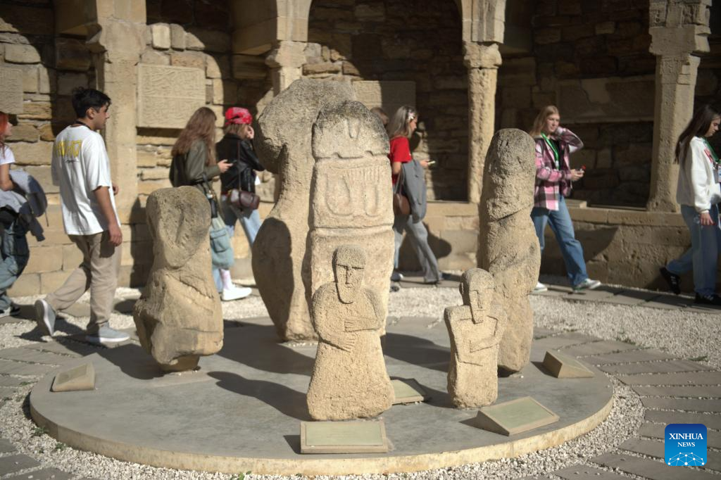 This photo taken on Oct. 28, 2025 shows tourists visiting an open-air archaeological exhibition in Baku's Old City, Azerbaijan. The Old City, the historical core of Baku, is a UNESCO World Heritage Site. (Xinhua/Chen Junfeng)