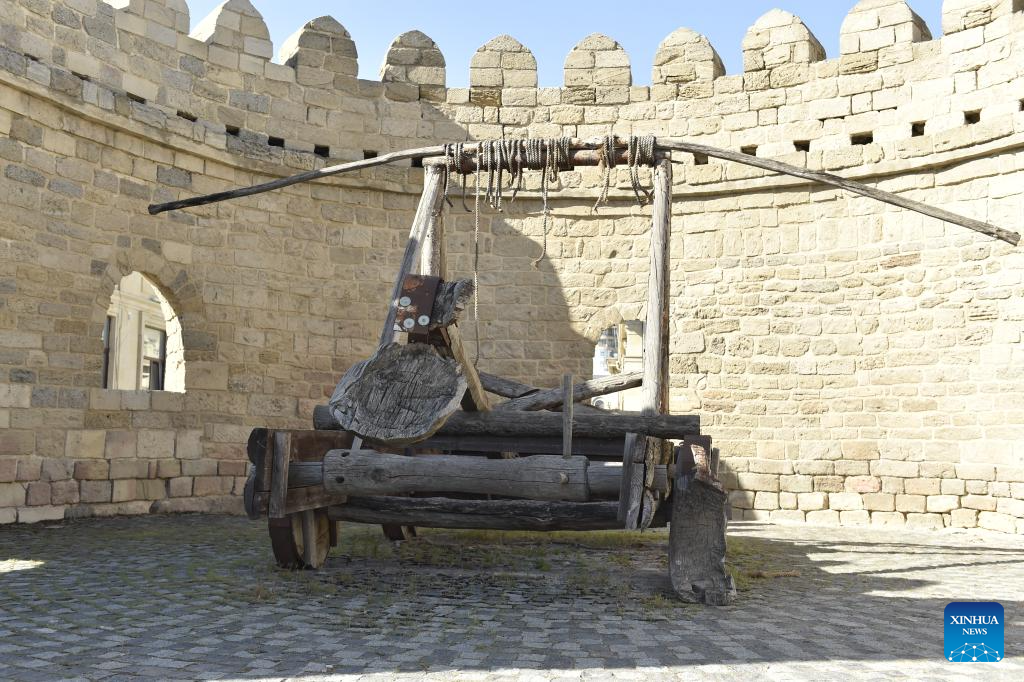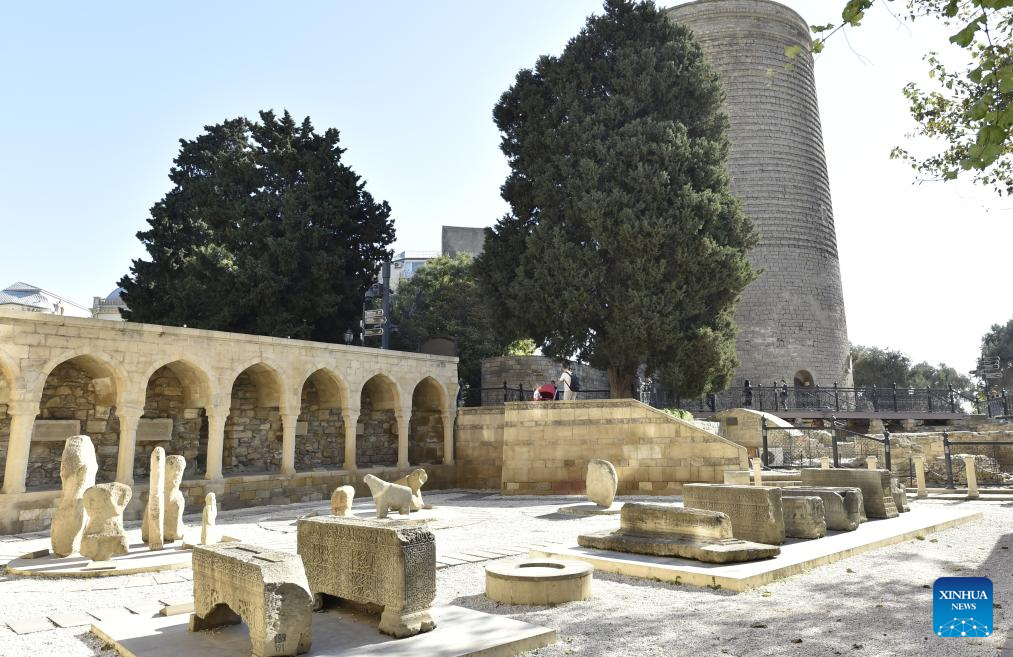 This photo taken on Oct. 28, 2025 shows a view of an open-air archaeological exhibition in front of the Maiden Tower, in Baku's Old City, Azerbaijan. The Old City, the historical core of Baku, is a UNESCO World Heritage Site. (Xinhua/Chen Junfeng)
