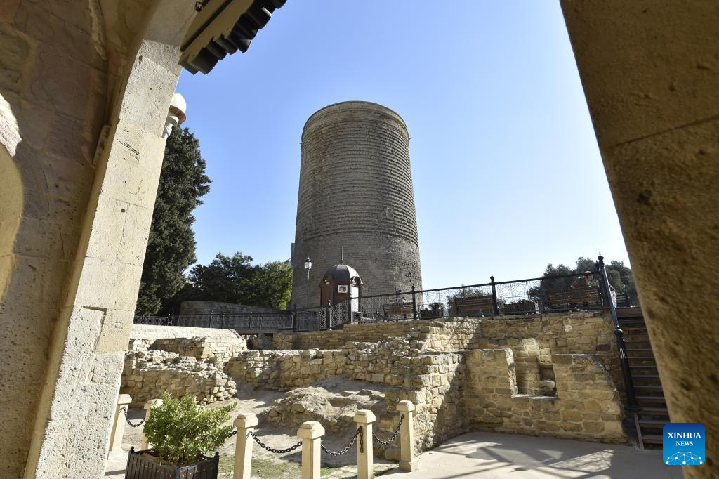This photo taken on Oct. 28, 2025 shows a view of the Maiden Tower in Baku's Old City, Azerbaijan. The Old City, the historical core of Baku, is a UNESCO World Heritage Site. (Xinhua/Chen Junfeng)