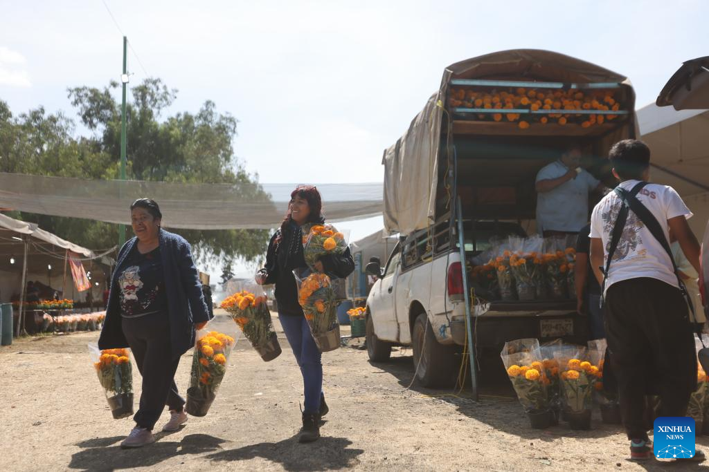 People buy marigold flowers, known as cempasuchil, used during Day of the Dead celebrations, at the central de Abasto market in Mexico City, Oct. 29, 2025. (Xinhua/Li Mengxin)