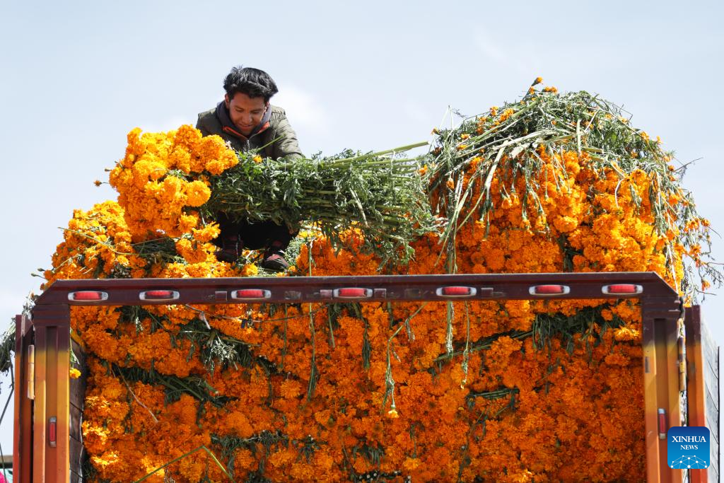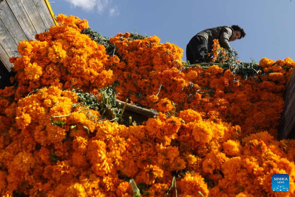 A vendor unloads marigold flowers, known as cempasuchil, used during Day of the Dead celebrations, at the central de Abasto market in Mexico City, Oct. 29, 2025. (Photo by Francisco Canedo/Xinhua)