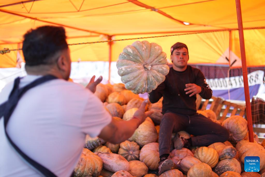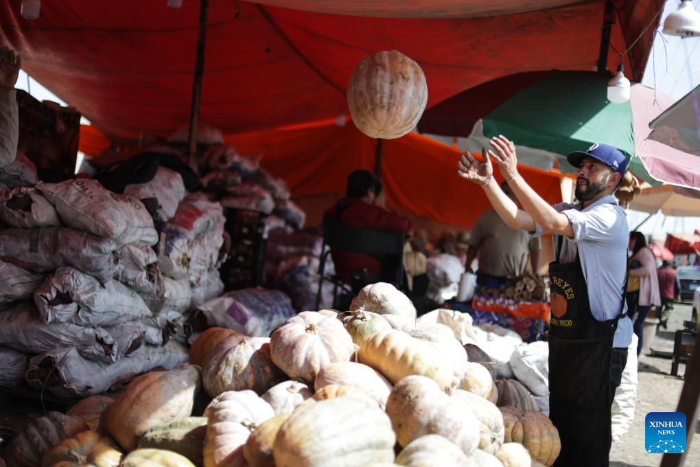 A vendor unloads pumpkin ahead of Day of the Dead celebrations, at the central de Abasto market in Mexico City, Oct. 29, 2025. (Photo by Francisco Canedo/Xinhua)