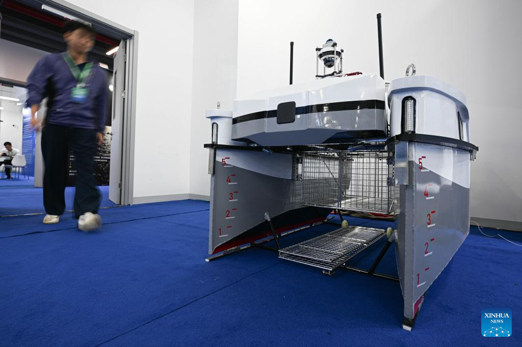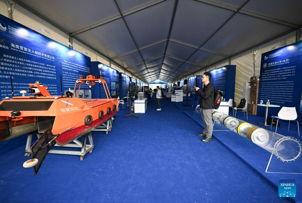 This photo taken on Oct. 29, 2025 shows a smart unmanned cruising device for cleaning surface ocean waters at the Deep-Sea Advanced Technology & Equipment Achievement Exhibition in Sanya, south China's Hainan Province. The exhibition, which took place here from Oct. 28 to 30, featured a total of 123 exhibits including deep-sea operation equipment, unmanned vehicles, communication and navigation devices, sensors, etc., highlighting China's innovative achievements in deep-sea technology. (Xinhua/Pu Xiaoxu)