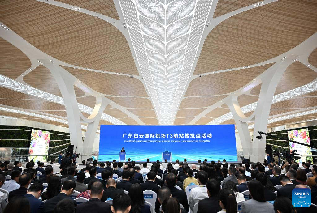 This photo taken on Oct. 30, 2025 shows a scene at the inauguration ceremony of Guangzhou Baiyun International Airport Terminal 3 in Guangzhou, south China's Guangdong Province. The Baiyun airport in Guangzhou, capital of south China's Guangdong Province, on Thursday officially put into operation its Terminal 3 and fifth runway, making it China's first civil airport to operate five commercial runways.
