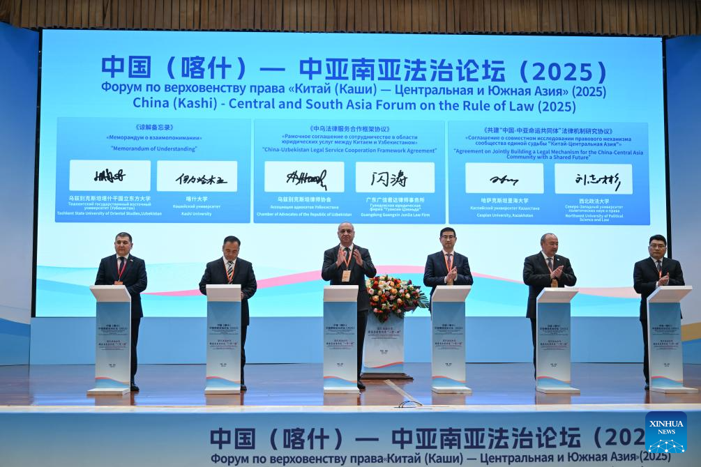 Guests attend a signing ceremony during the China (Kashgar) - Central and South Asia Forum on the Rule of Law (2025) in Kashgar, northwest China's Xinjiang Uygur Autonomous Region, Oct. 30, 2025. The forum kicked off here on Thursday. (Xinhua/Ding Lei)