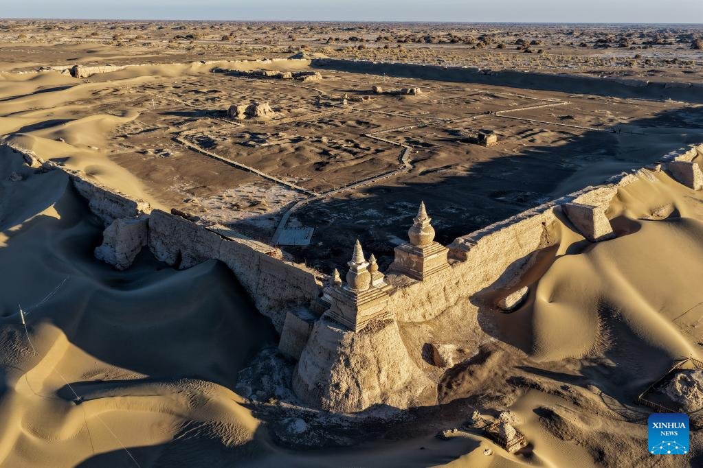 An aerial drone photo taken on Oct. 29, 2025 shows a view of the Heicheng ruins in Ejina Banner of Alxa League, north China's Inner Mongolia Autonomous Region. The Heicheng ruins, built in the ninth century, was the largest and best preserved ancient city on the Silk Road. (Xinhua/Lian Zhen)