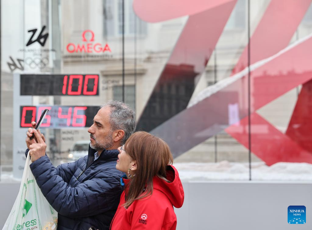 A man takes a photo of the digital countdown timer of Milano-Cortina 2026 Olympic Games in Milan, Italy, Oct. 29, 2025. A ceremony marking 100 days to the opening of the Milano-Cortina 2026 Olympic Winter Games was held at Palazzo Lombardia in Milan, where organizers unveiled the official podiums for the Olympic and Paralympic Games and introduced 12 "digital torchbearers", symbolizing the start of the final stage of preparations for the event. (Xinhua/Li Jing)