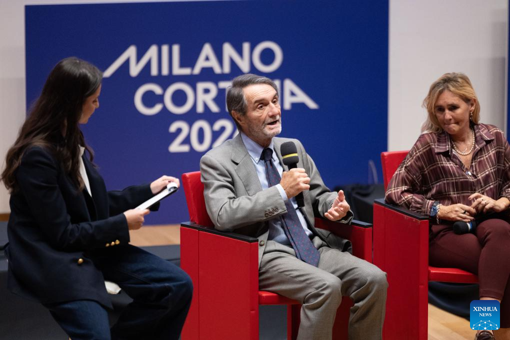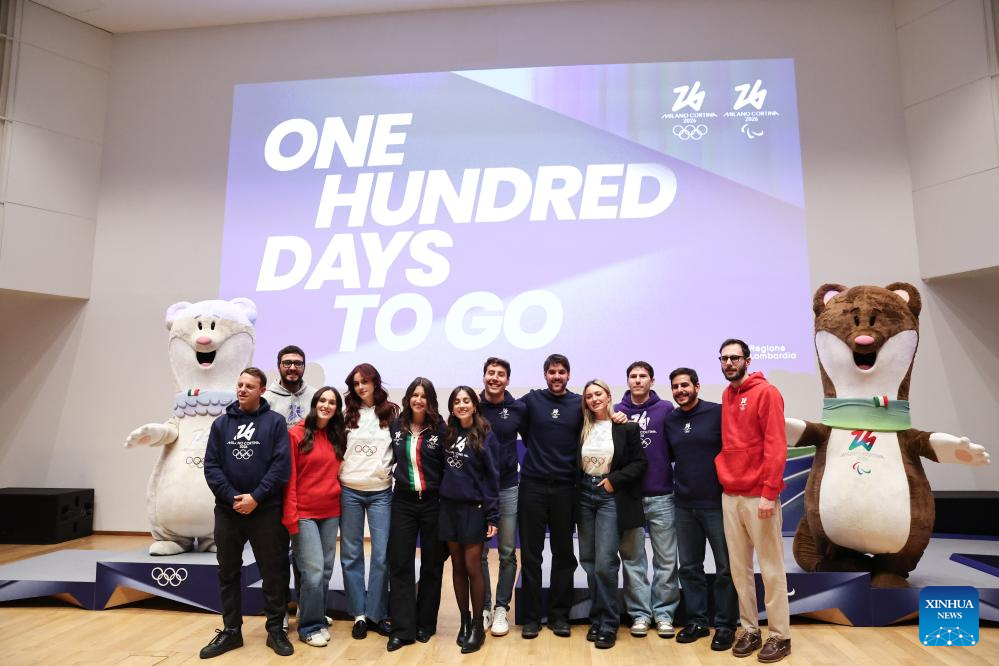 A ceremony marking 100 days to the opening of the Milano-Cortina 2026 Olympic Winter Games was held at Palazzo Lombardia in Milan, where organizers unveiled the official podiums for the Olympic and Paralympic Games and introduced 12 "digital torchbearers", symbolizing the start of the final stage of preparations for the event. (Xinhua/Li Jing)